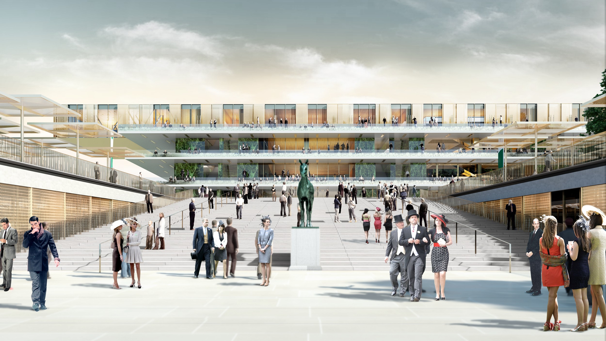 Myšlenkou bylo postavit budovu, která by neměla jen čelní a zadní stěnu, ale takovou, kde by každá z průčelí nabízela výhledy zvláštní kvality, a to vždy ve vztahu ke krajině, obloze a závodním drahám.