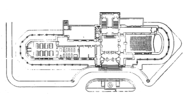 Hlavní budova z výstavního panelu – text z publikace Česká moderní architektura, prof. Vladimír Šlapeta